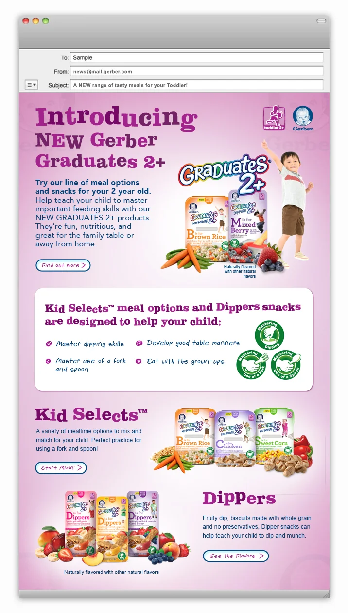 Gerber wanted to promote their new Graduates 2+ product line, designed for toddlers aged 2 and up to help master self-feeding. This includes tasks like picking out and mixing and matching their own meals and incorporating advanced hand skills like dipping and using utensils.